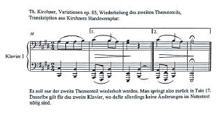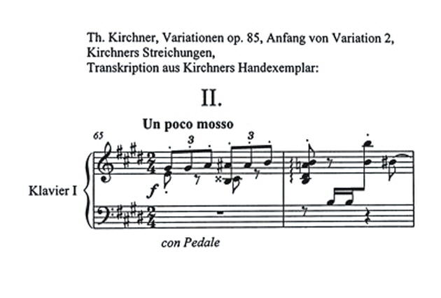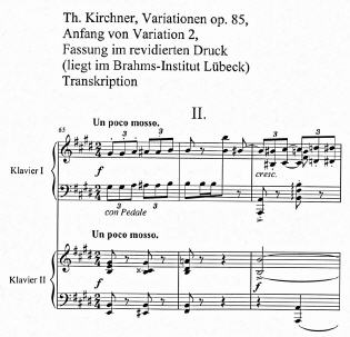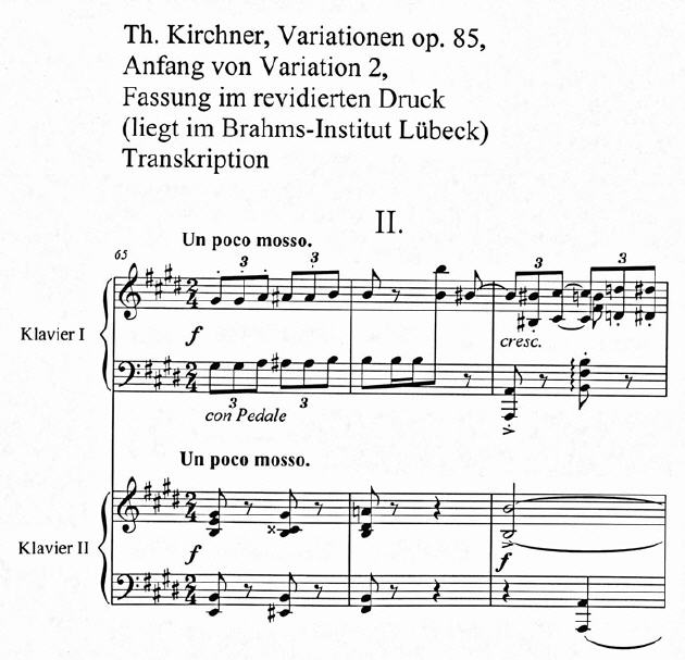 Theodor Kirchner, Variationen op. 85, Transkription der Änderungen in Kirchners Handexemplar, Kirchners Streichungen am Anfang der 2. Variation. Das zweite Klavier hat zwei Takte Pause. Das Handexemplar liegt im Brahms-Institut in Lübeck.
