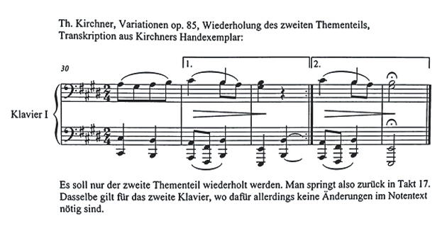 Theodor Kirchner, Variationen op. 85, Transkription der Änderungen in Kirchners Handexemplar, Schluss des Themas (T. 32): Von Hand eingetragene Wiederholungszeichen: Es soll nur der zweite Teil des Themas wiederholt werden, also die Takte 17-32. Das Handexemplar liegt im Brahms-Institut in Lübeck. (Das Bild ist vergrösserbar: mit dem Pfeil übers Bild fahren!)