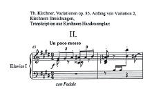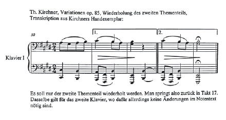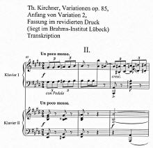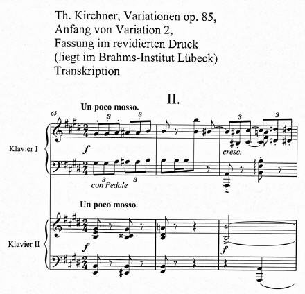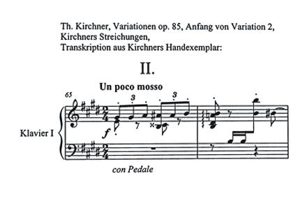 Theodor Kirchner, Variationen op. 85, Transkription der Änderungen in Kirchners Handexemplar, Kirchners Streichungen am Anfang der 2. Variation. Das zweite Klavier hat zwei Takte Pause. Das Handexemplar liegt im Brahms-Institut in Lübeck. (Das Bild ist vergrösserbar: mit dem Pfeil übers Bild fahren!) |